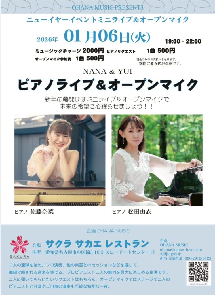 1月6日(火)にサクラサカエレストランにて、ニューイヤーミニライブ&オープンマイクを行います。
