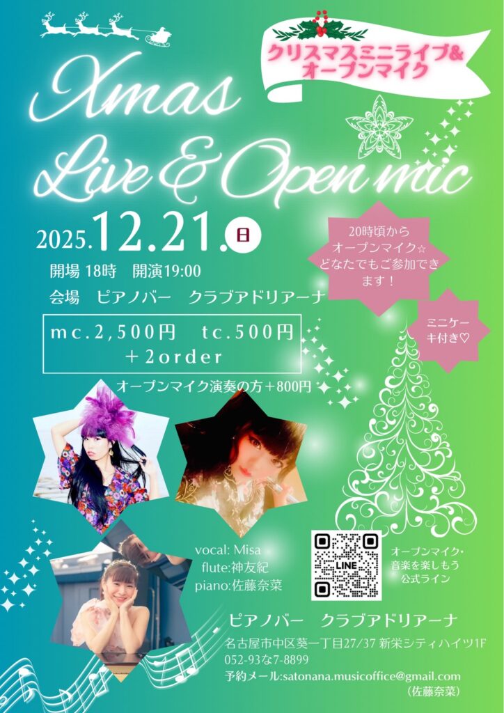 12月21日にアドリアーナにて、クリスマスミニライブ+オープンマイクを行います。出演は、私、ピアノに佐藤奈菜に、ヴォーカルMisaちゃんとフルートYukiちゃんです。20時くらいからオープンマイクとなります。