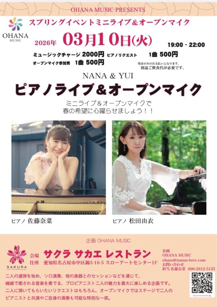 この春、名古屋・栄にある「サクラ サカエ レストラン」にてミニライブ&オープンマイクイベントを開催します。